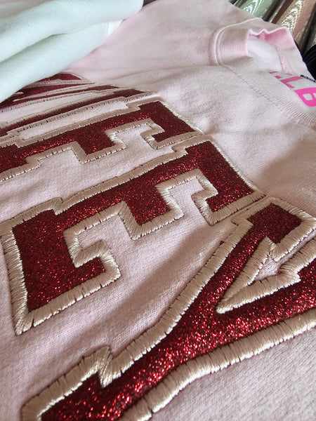 ✨ Glitter Embroidery Colors: pink, red, white, blue, silver, black, aqua, or champagne gold