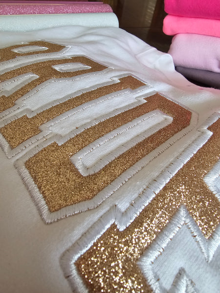 Our Glitter Embroidered Wifey + Bride Sweatshirts are the perfect mix of cozy, customizable, and oh-so-glam. Designed and embroidered in-house at Crafty Lady Boutique, each sweatshirt is made just for you — glitter thread and all!