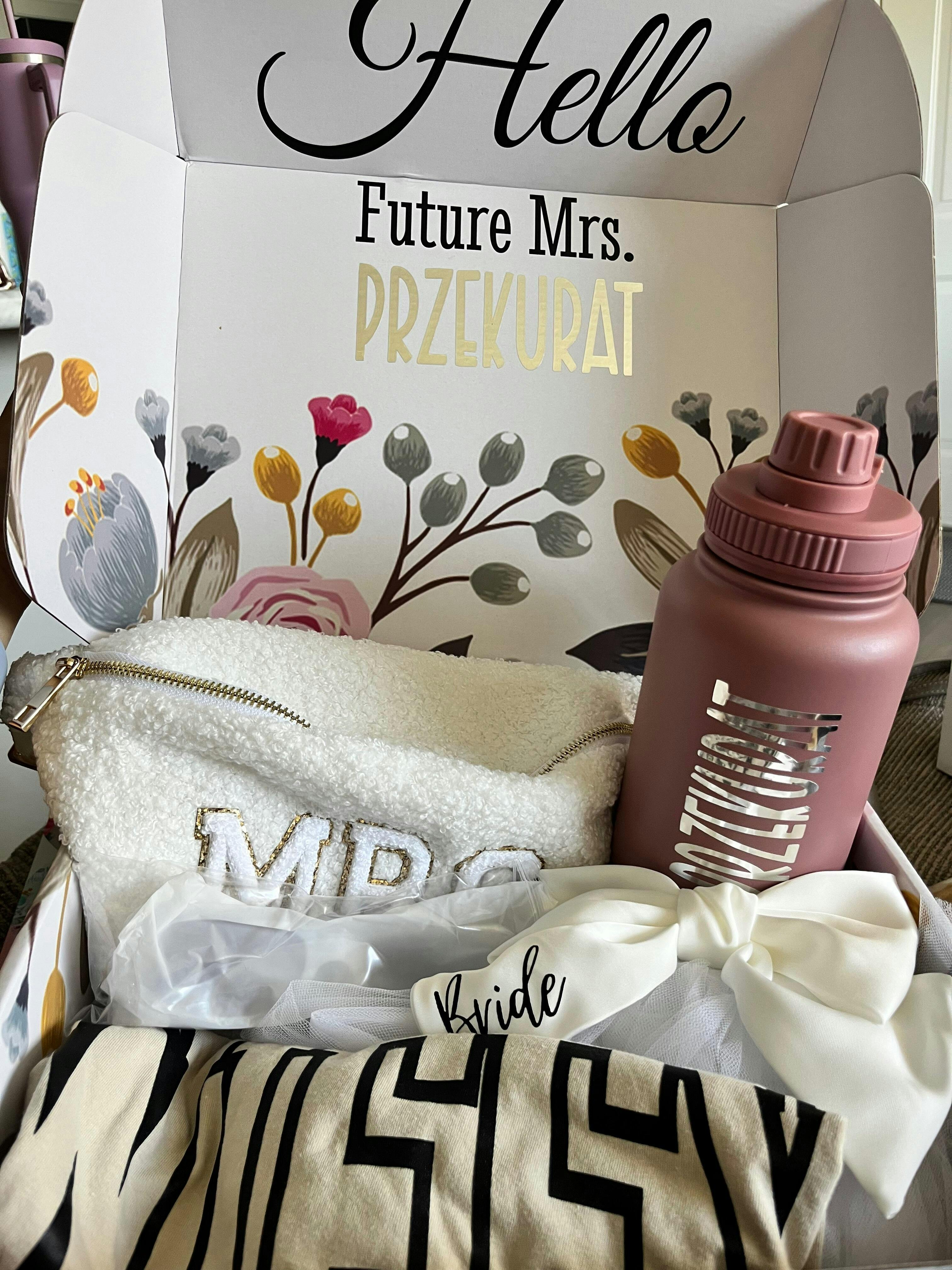 Lexie truly nailed every detail ✨ I got two of the cutest t-shirts (one personalized just for me 😭), the MOST adorable PJ set with “Future Mrs. Bidwell” on it (I screamed), a precious trinket/ring dish with a “B”, and a mini day-of perfume bottle that is such a perfect, thoughtful touch 🥰